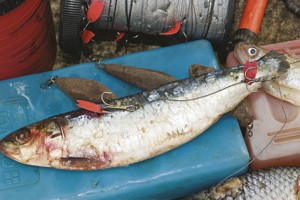 3 The paternoster and drifting method, on the other hand, requires your deadbait to be thawed out. Set your hooks so the bait looks alive by putting one hook in the dorsal fin and the other in the pectoral fin.